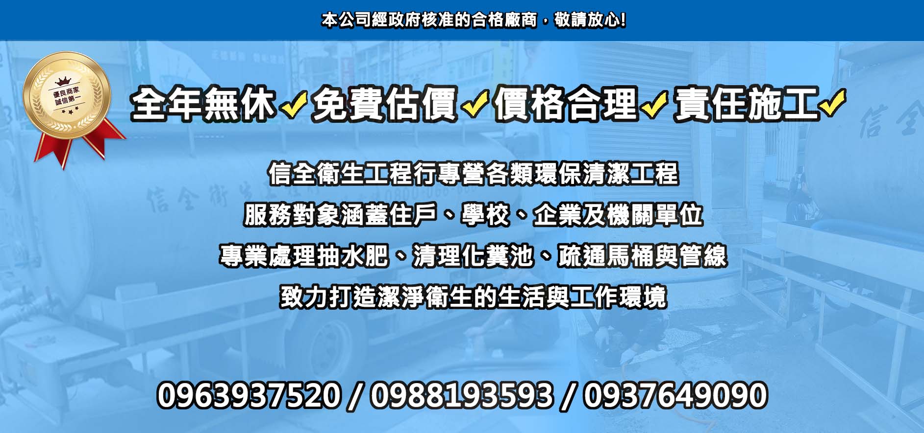 📞 快速服務專線:0937-649-090 📞 快速服務專線:0963-937-520 📞 快速服務專線:0988-193-593 信全衛生工程行 抽水肥丨通馬桶通水管丨清理化糞池修繕化糞池丨汙水槽處理 桃園市 桃園區、中壢區、平鎮區、八德區、楊梅區、蘆竹區、龍潭區、龜山區、大溪區、大園區、觀音區、新屋區。 新竹縣市 東區、北區、香山區、竹北市、竹東鎮、新埔鎮、關西鎮、新豐鄉、峨眉鄉、寶山鄉、五峰鄉、橫山鄉、北埔鄉、尖石鄉、芎林鄉、湖口鄉。 ☑ 政府立案,合法經營,並持有乙級廢棄物清除合格證書,服務品質值得信賴。☑ 價格合理免費現場估價,價格合理可議,不亂砍價搶案子,才有辦法把品質顧好。☑ 我們擁有多款水肥車與水溝車(3.5噸至17噸)及合法證照,長年服務大台北、桃園、新竹地區。歡迎社區、學校、公家機關洽詢或簽約定期清運。 一通電話 立刻安排 抽水肥/通馬桶/通水管 清理化糞池/修繕化糞池 汙水槽處理/ 桃園市桃園區、中壢區、平鎮區、八德區、楊梅區、蘆竹區、龍潭區、龜山區、大溪區、大園區、觀音區、新屋區。 新竹縣市東區、北區、香山區、竹北市、竹東鎮、新埔鎮、關西鎮、新豐鄉、峨眉鄉、寶山鄉、五峰鄉、橫山鄉、北埔鄉、尖石鄉、芎林鄉、湖口鄉。 電話 096393752009881935930937649090